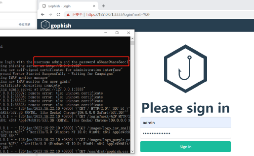 (1)Gophish安装,通过下方连接下载gophish然后双击运行,访问http://127.0.0.1:3333即可进入到gophish后台管理页面,登陆账号为admin,密码为随机生成的。https://github.com/gophish/gophish/releases![]()