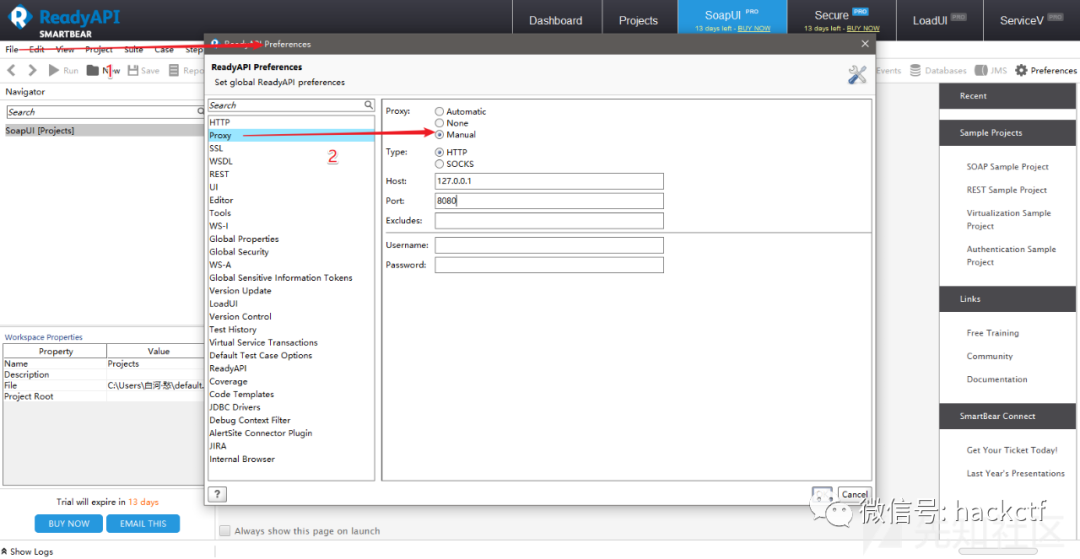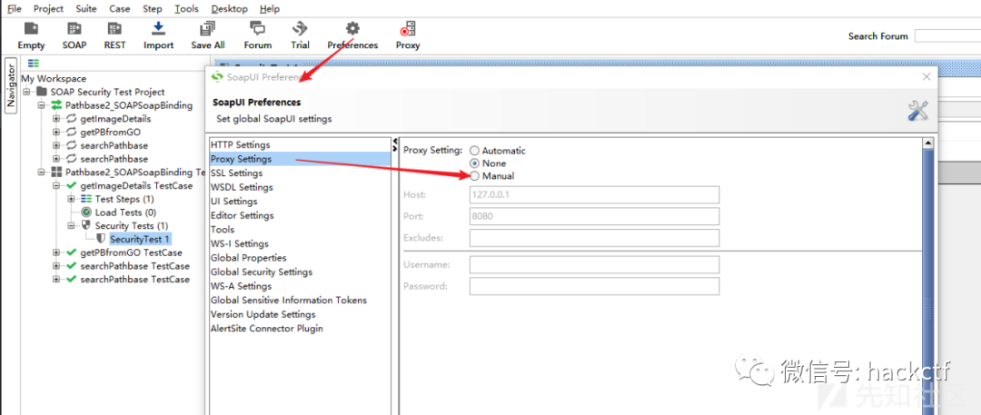 SOAP 配置,2步,“File”-“Preference”-“Proxy”,设置 Burp 代理