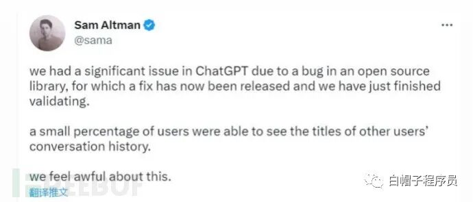 然而近日,ChatGPT 遇到了大麻烦——被爆用户聊天记录泄露 ,逼得 OpenAI 首席执行官萨姆 · 奥尔特曼不得不亲自出面,在其社交媒体上发文解释 BUG 问题源于开源代码库中存在的一个错误,最终导致用户 ChatGPT 聊天历史泄露,目前开发团队已经发布修复程序,且已经完成验证,对此非常抱歉。