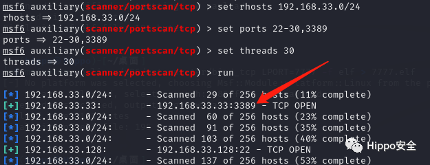 set rhosts 192.168.33.0/24set ports 22-30,3389set threads 30run