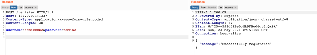 POST /register HTTP/1.1Host: 127.0.0.1:1337Content-Type: application/x-www-form-urlencodedContent-Length: 38username=admixxxn2&password=admin2