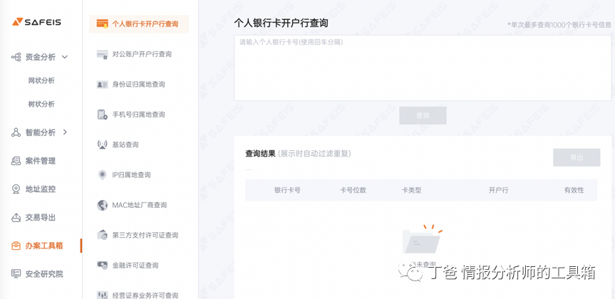 辅助查案的工具,帮助办案人员释放数据价值。提供“身份证归属地、银行卡开户行、手机号归属地、IP归属地”等14种信息的查询工具。