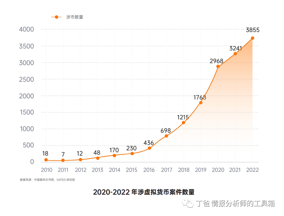 2018-2022年虚拟货币犯罪案件数量激增。2018 年,波场 (Tron) 上线 。2021 年,非同质化代币 (NFT) 快速发展,打开了区块链的商品化大门,也为涉案资金的转移提供了新的隐匿方式。到 2022 年,案件数量达到 3855 起,同比涨幅达 19%。