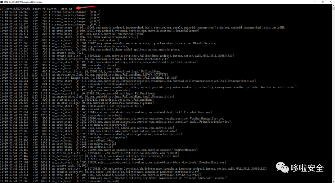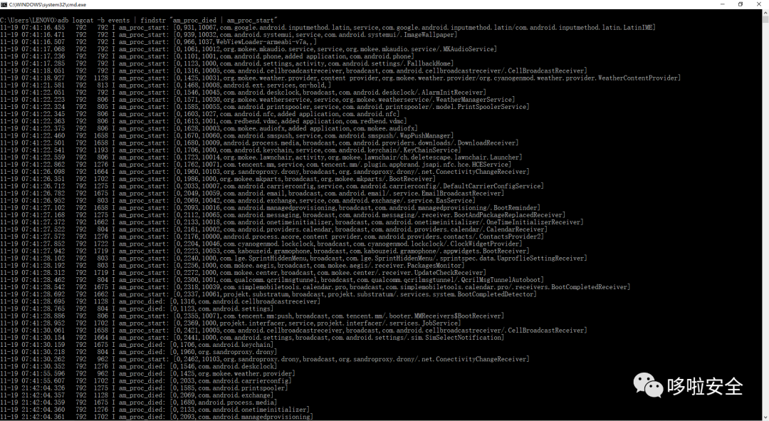 adb logcat -b events | findstr “am_proc_died | am_proc_start” //查看进程的启动信息,每个进程的启动信息和死亡信息(2).Activity生命周期相关分析