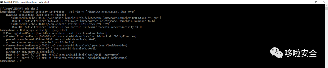 adb shell dumpsys activity activities | sed -En -e '/Running activities/,/Run #0/p'adb shell dumpsys activity | grep clock
