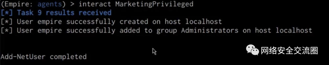 1、第一步将涉及与代理交互并选择“add_netuser”模块,这可以通过运行以下命令来完成: