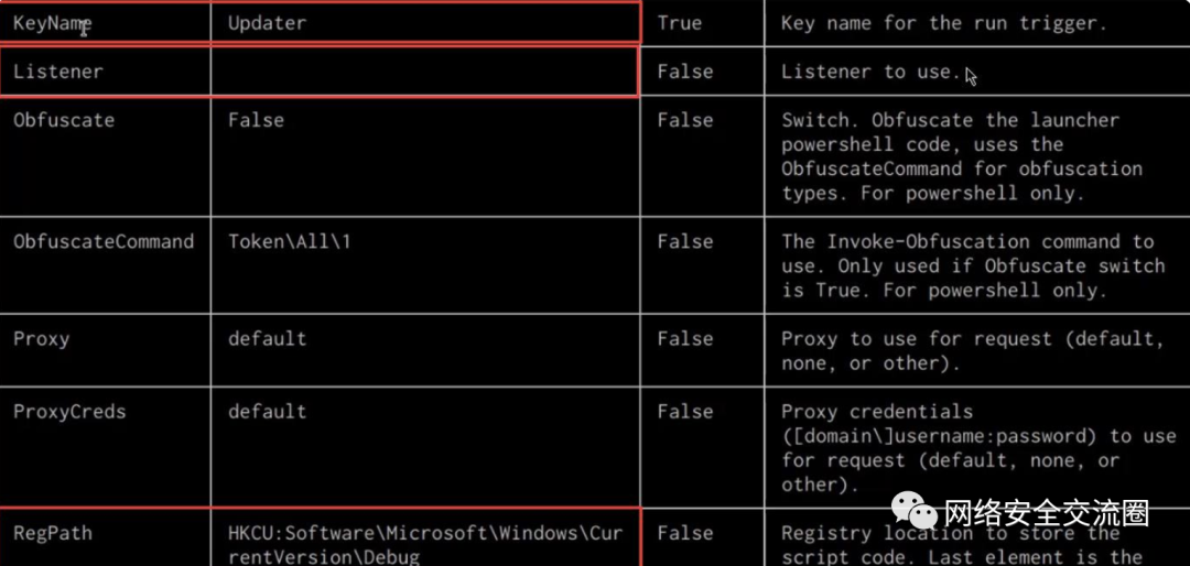 2、选择模块后,我们需要配置模块选项,如Agent、Listener、KeyName和RegPath。这