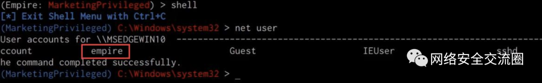 execute5、我们还可以通过在目标系统上运行net user命令来确认新用户帐户已添加,如下面的屏