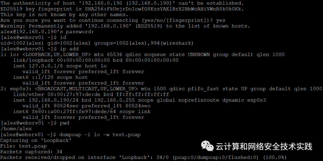 发现当前账户可以抓包,dumpcap -i lo -w test.pcap,