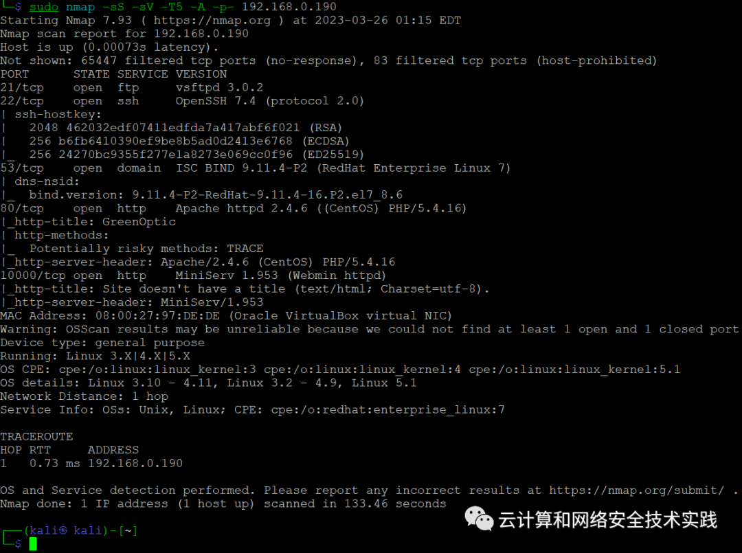再继续做端口扫描,sudo nmap -sS -sV -T5 -A -p- 192.168.0.190,