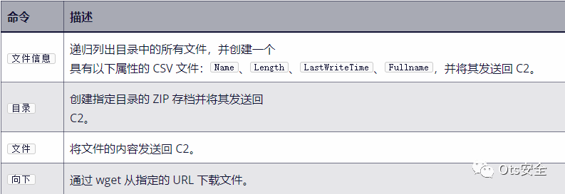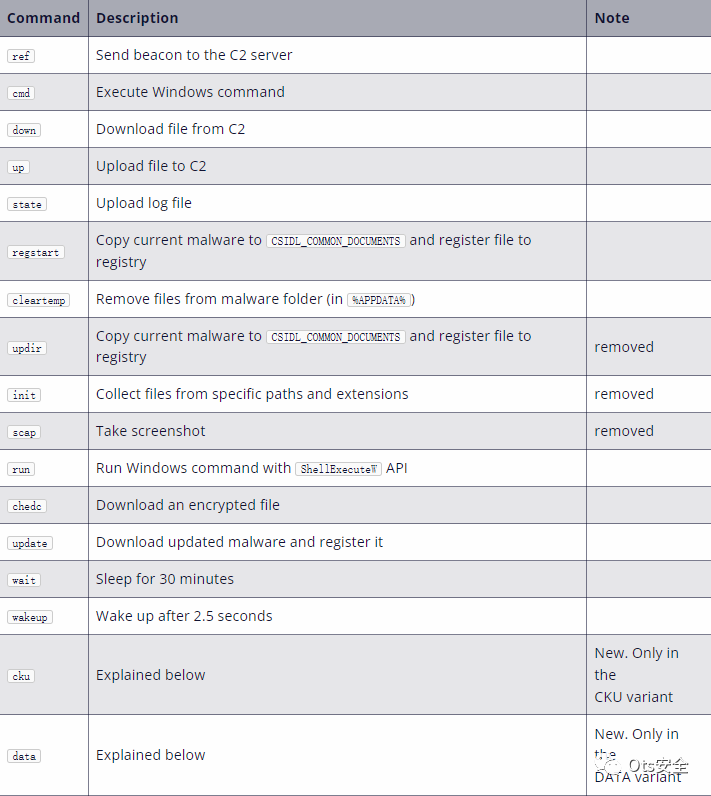 除了硬编码命令外,dispatch_command函数还包含其他可用命令,从而可以区分卡巴斯基在 2021 年底发现的样本和 SEKOIA.IO 分析师观察到的样本的功能。下表显示了添加和删除的命令。