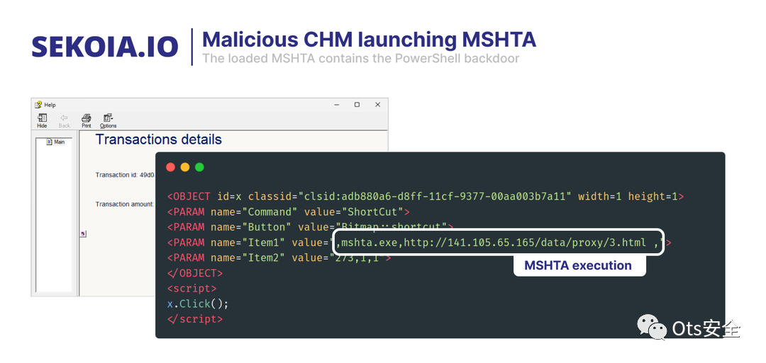 我们调查期间检索到的感染来自 2021 年以来的在线 Github 存储库,并被 Reaper 用作暂存基础设施。大多数感染媒介(其中有十几个)是包含恶意Microsoft 压缩 HTML (CHM) 文件的RAR 和 ZIP 存档,有时与诱饵“受密码保护”的良性文档相关联。打开后,这些 CHM 文件会执行MSHTA以下载并启动 Chinotto Powershell 后门的轻型变体,如下所示: