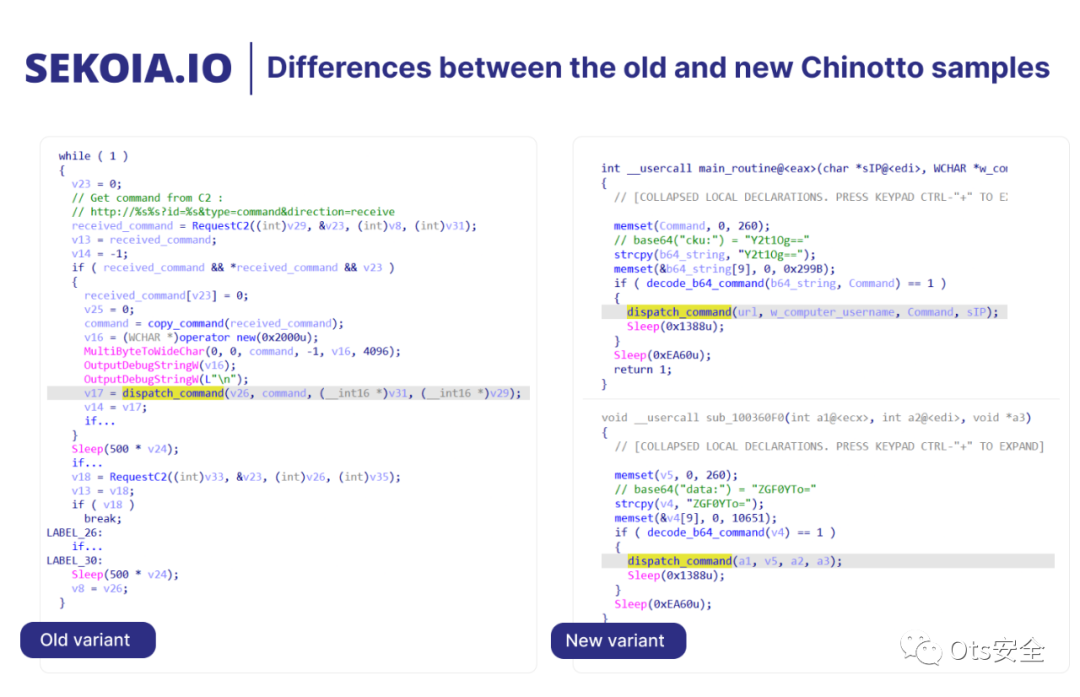 上图概述了旧样本和新样本之间观察到的差异。图的左侧显示了一个 while 循环,其中包含从 C2 请求命令并执行该命令的函数。在较新的版本中(图的右侧),while 循环以及从 C2 请求命令的函数都被删除了。相反,该命令在 base64 中被硬编码。上半部分对应“cku”版本,下半部分对应“data”版本。