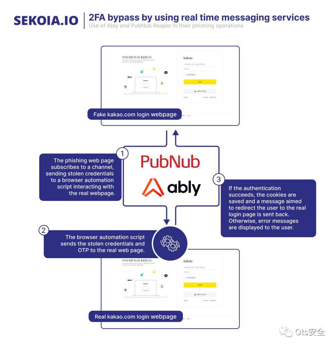 第二种是针对 iCloud、Naver 和 Kakao,它更复杂,因为它可以依靠四种不同的技术(HTTP、websockets 和实时消息传递公共服务 Ably 和 Pubnub)来绕过双因素身份验证 (2FA) 机制。