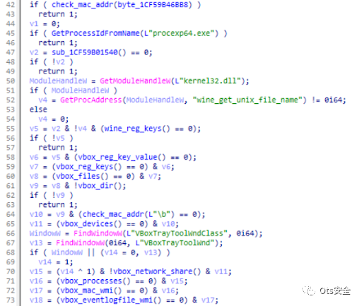 一旦新部分被转储,BumbleBee 有效负载就可以被分析。首先,值得注意的是,该恶意软件几乎使用了 al-khaser github 项目的完整复制/粘贴,如其他文章或相关 BumbleBee 讨论中所述。al-khaser 代码实施了几种反检测技术。下图显示,如果发现其中一个反虚拟环境,BumbleBee 有效负载的主要功能将避免执行。