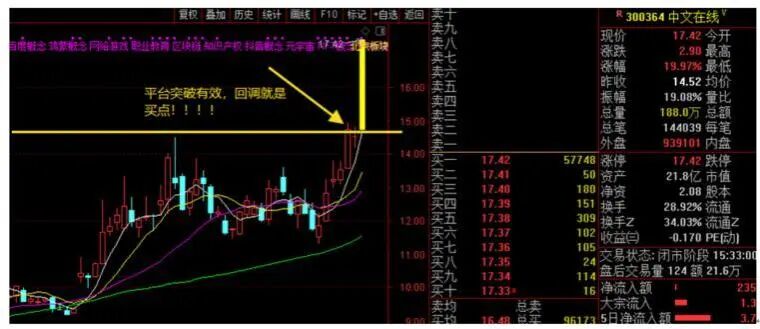 对于中文在线的逻辑,我提前在贴子里提到它:回调关注就好。这是一个好东西,因为一个股,放量突破平台后,往往回调就是主力空中加油的表现。一个股敢于平台突破说明了主升浪形态,主流逻辑,基本配合了。回调说明是遵下来,蹦得更高。后续我会专门分享一个平台突破的选股思路。