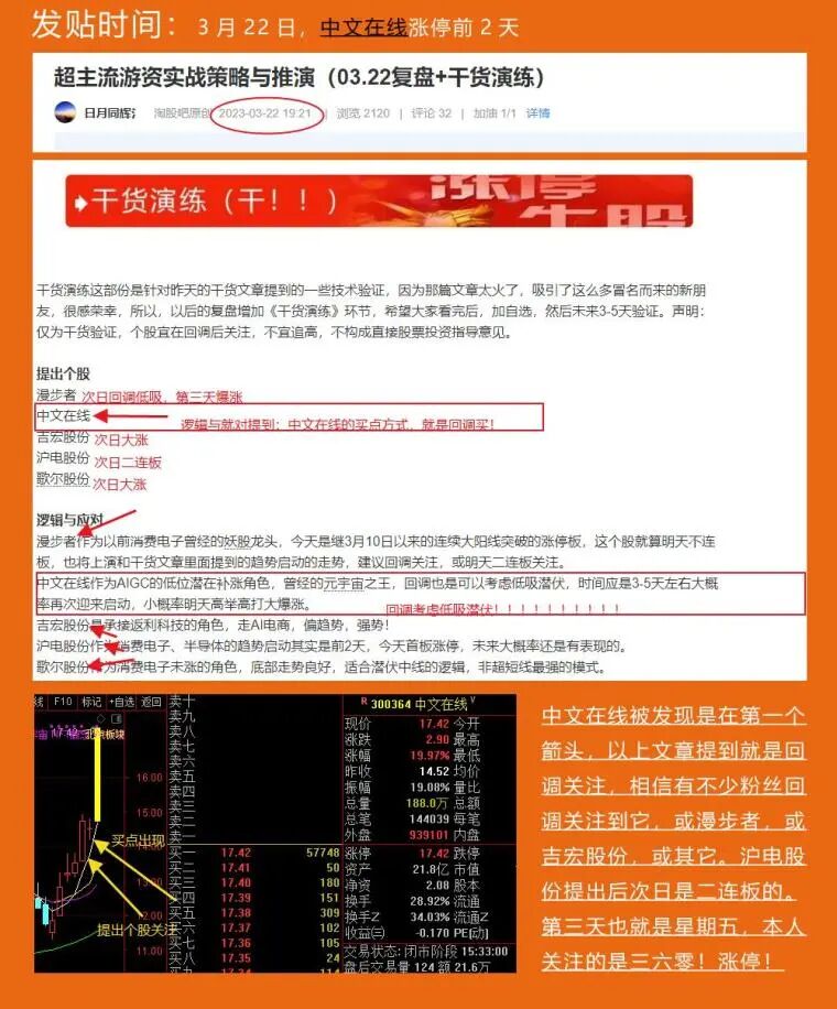 以上的干货演练是一个执行干货与认知的一个马前炮提出,买点模式是低吸潜伏为主。低吸潜伏也应该最大可能地回到主流上,中文在线属于AI人工智能AIGC,也是以前炒作的元宇宙的焦点核心。它的走势在分享的当天是放量大阳线,这是不是符合我提出的那篇干货《注册制下的超短线生态龙头战法选股思路分享——选股(板块)篇》提到的第二部份:情绪推动后续炒作主流中的关于量能异动这个技术要点。