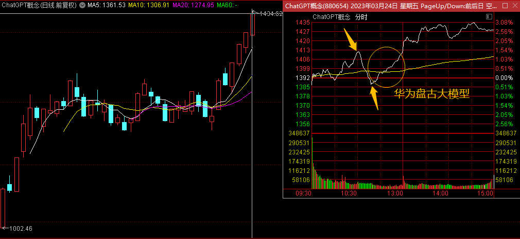 周四尾盘有些高潮迹象,周五盘中再度冲高然后大幅跳水,然而跳水没有一直持续,稍后在华为盘古大模型的带动下,又回去了,相当于日内经历一波调整,但随后修复了。