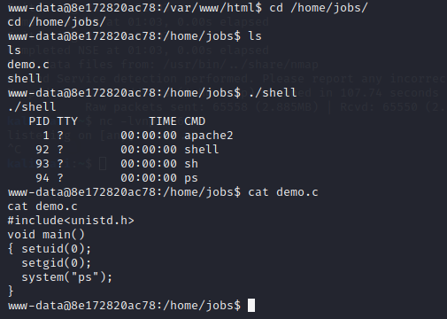 通过执行发现该脚本执行了PS命令且并未使用绝对路径,源码在demo.c中可以清楚看到