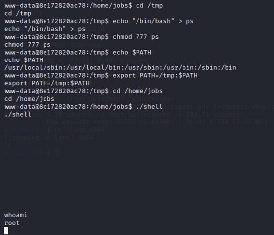 那么我们尝试更改$PATH来执行我们的恶意程序,从而获得目标主机的高权限shell