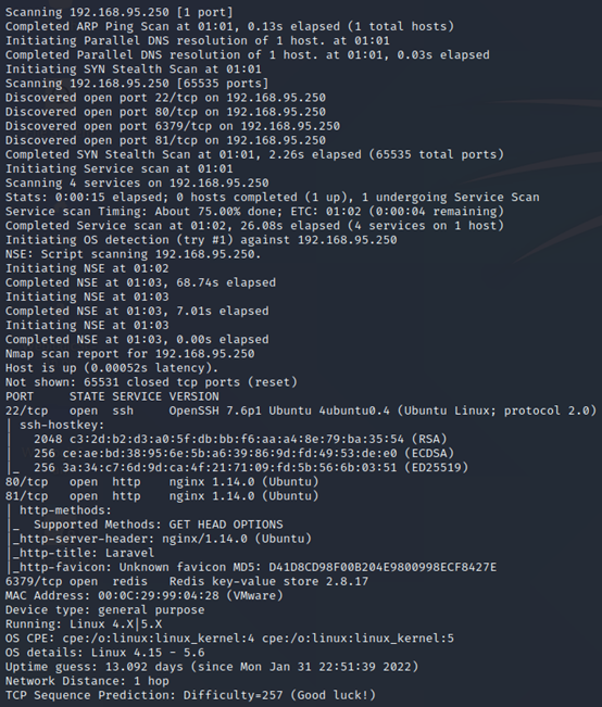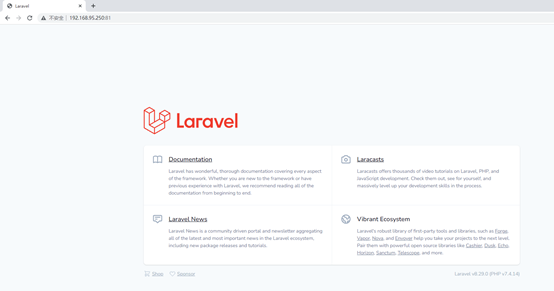 扫描后发现开放了22、80、81、6379端口,访问80端口为一个博客网站,访问81端口发现是Laravel框架且版本是Laravelv8.29.0 (PHP v7.4.14)。