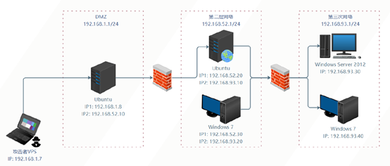 至此,外网渗透完成,此时我们已经拿下两台主机,网络拓扑如下: