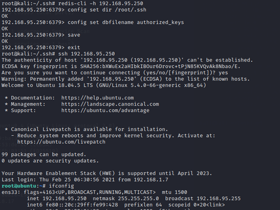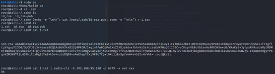 然后使用kali连接目标主机的redis,并执行命令将ssh公钥写入目标主机,写入后成功连接。