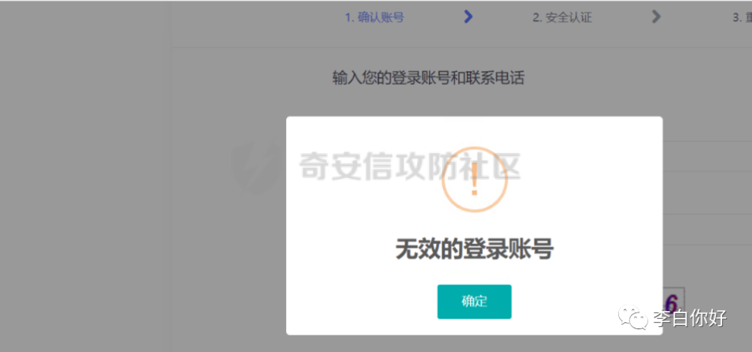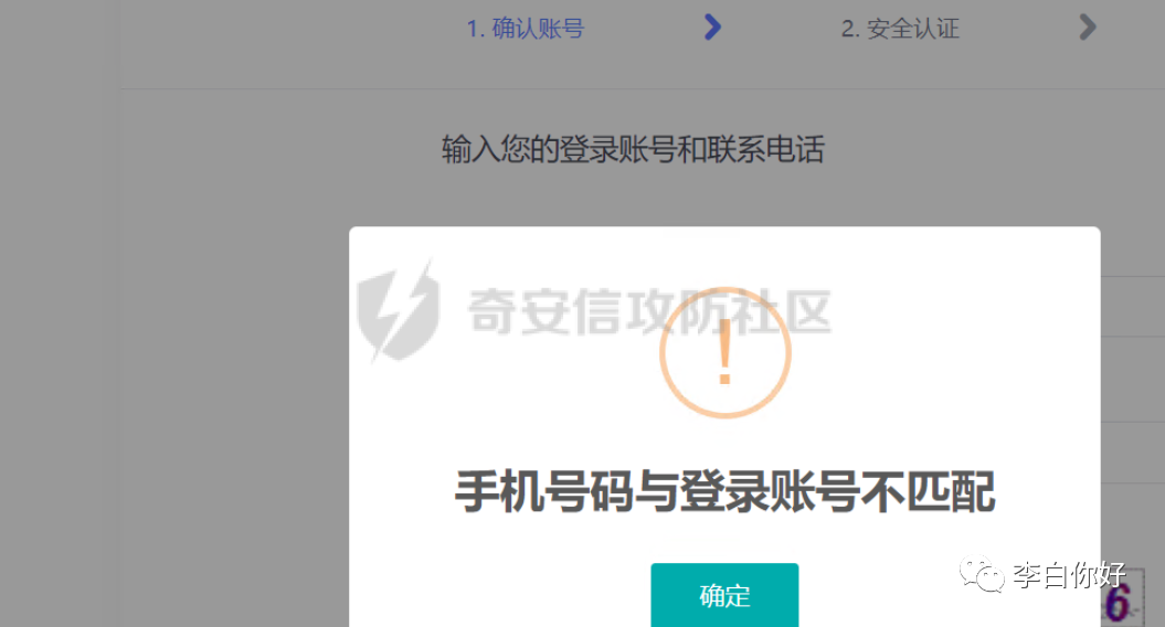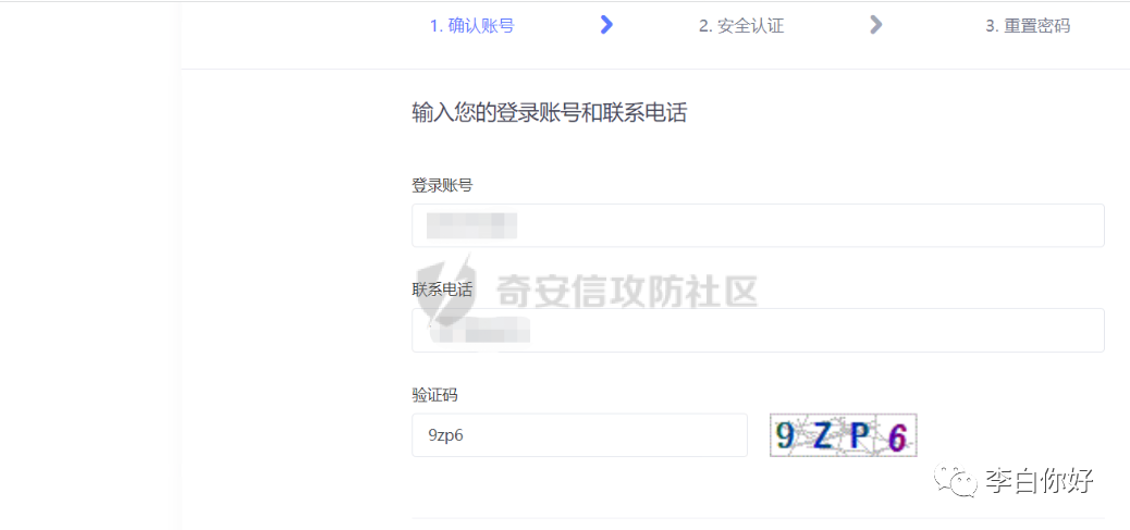 1、确认账号:(需要输入登录账号、联系电话和验证码),这一步的目的应该是要确认该账号与你输入的联系电话是否一致。