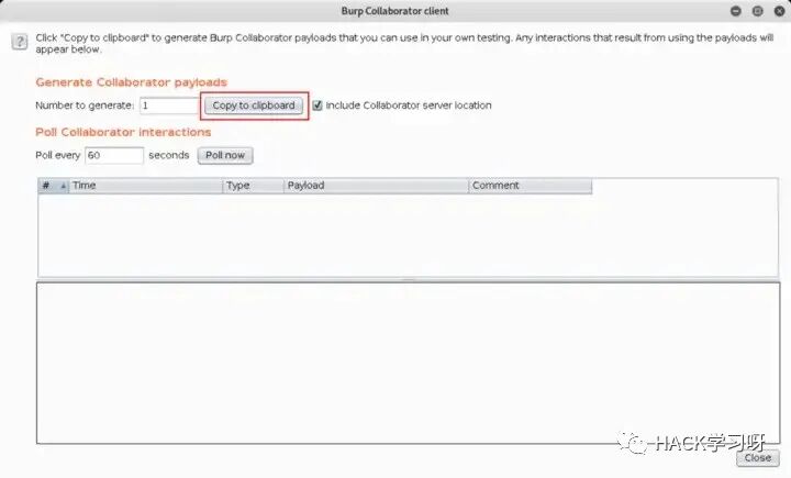 1. 打开 Burp Suite代理工具并转到 Burp 菜单并选择“Burp Collaborator 客户端”。生成 Collaborator 负载并将其复制到剪贴板。