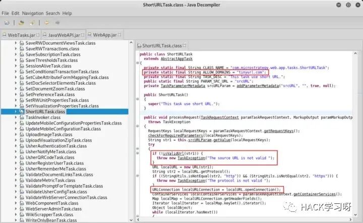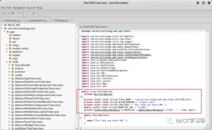 我简单地使用jd-gui工具反编译了那个 jar 文件并开始审查代码。我的主要目标是shortURL任务,它处理短 URL 并且不检查有效的身份验证会话。最后我从一个 jar 文件中找到了那个 Java 类。