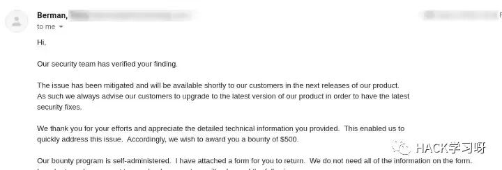 他们回答说,他们能够重现该错误,并且正在研究补丁。他们会尽快向我通报赏金决定。