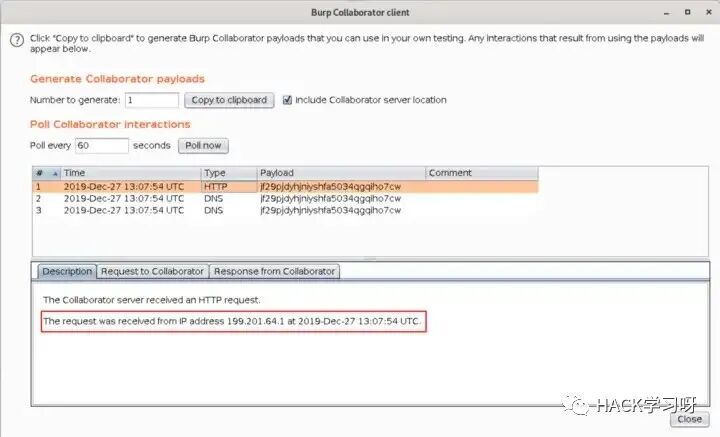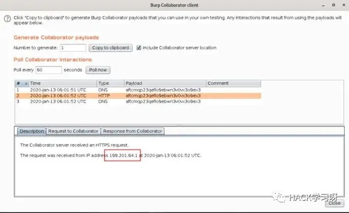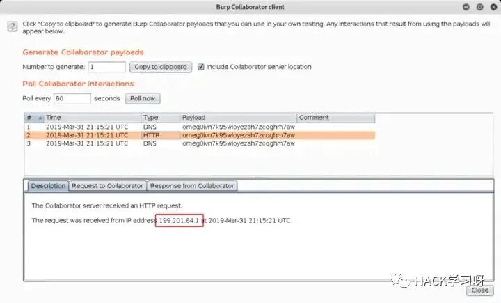 4. 观察 Burp Collaborator 立即点击,它显示收到请求的IP 地址“ 199.201.64.1 ”。