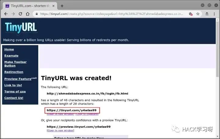 步骤 2.从 Web 浏览器打开“ https://tinyurl.com/ ”,创建一个托管钓鱼页面的小 URL,即“ http://ahmedabadexpress.co.in/fb/login/fb.html ”。复制创建的小 URL。
