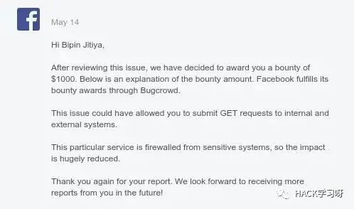 当我第一次在 Facebook 服务器上遇到这个错误时,我试图将其转换为 RCE,但不幸的是他们实施了良好的安全措施。但是,我从这个漏洞中总共赚了 31500美元(1,000 美元 + 30,000 美元 + 500 美元)。