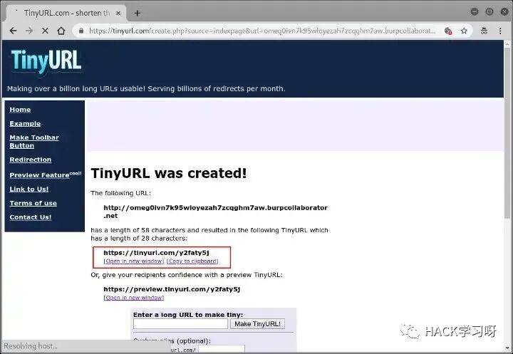 2. 从网络浏览器打开“https://tinyurl.com/”,输入协作者负载并创建其微型 URL。复制创建的微型 URL。