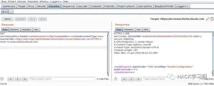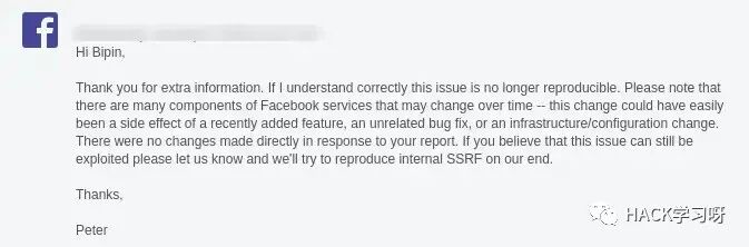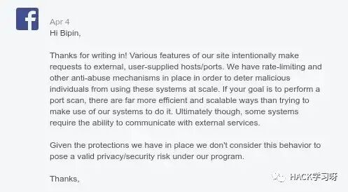 通过这种观察,我们可以枚举防火墙环境背后的内部基础设施。我很快向 Facebook 报告了我的发现,但被拒绝了,因为他们认为这不是安全漏洞。观察以下响应: