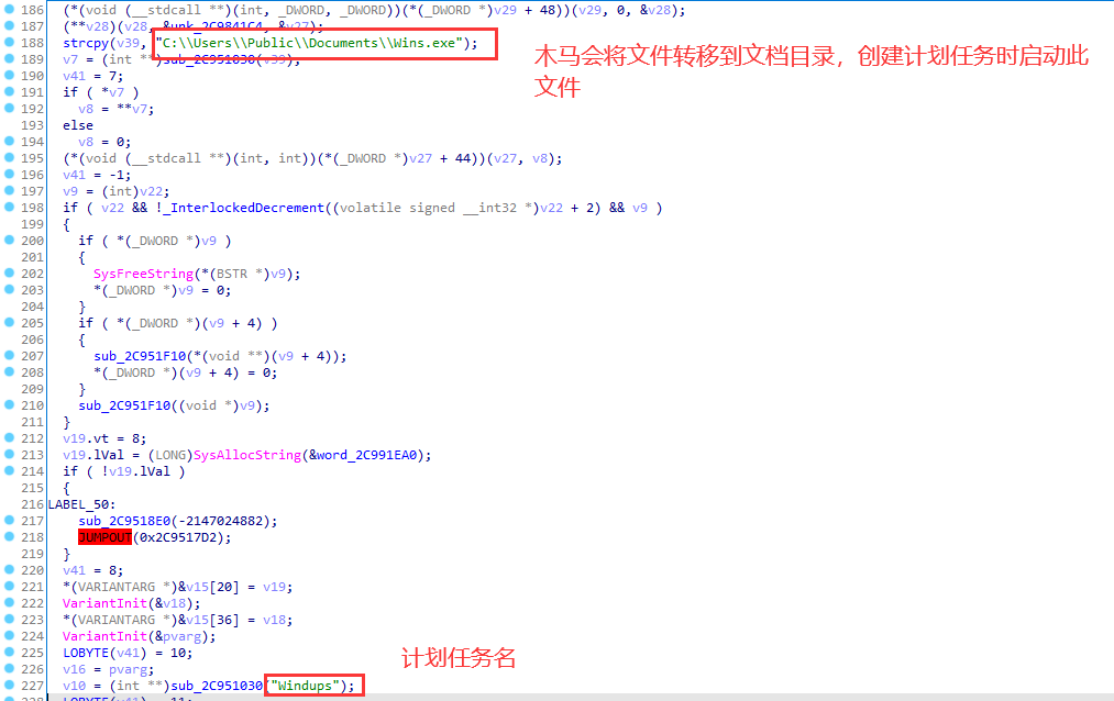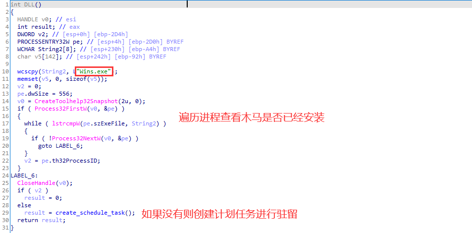 持久化模块会通过进程名(Wins.exe)检测木马是否已经安装,如果没有则创建计划任务进行驻留。