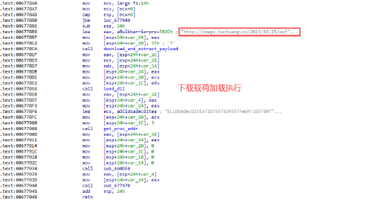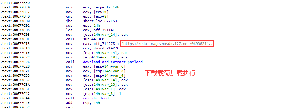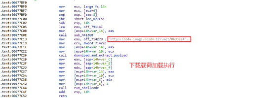 通过分析传播样本,可以发现相关的实际控制载荷使用存放图片的公共服务进行下载,并通过LSB隐写相关的shellcode在图片中。如下图所示,使用了image.tuchuang.co和edu-image.nosdn.127.net的公共服务,使得流量侧无法进行有效拦截。