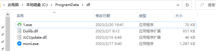 病毒样本执行后会在%ProgramData%/df目录下释放恶意文件,并启动moni.exe执行,moni.exe启动执行后会启动主要木马模块1.exe执行。