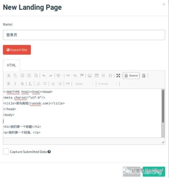 Name:登录页命名,(搜索了一些文档似乎这个功能确实没有太大的用处)Import site:设置选择钓鱼页,自动生成html文件,当然可以自己手动写html文档