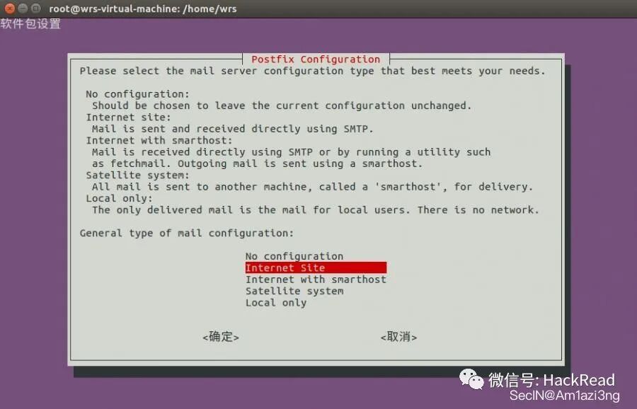 在安装的过程中,会提示输入选择类型和域名。分别填写"only localhost"和"localhost"