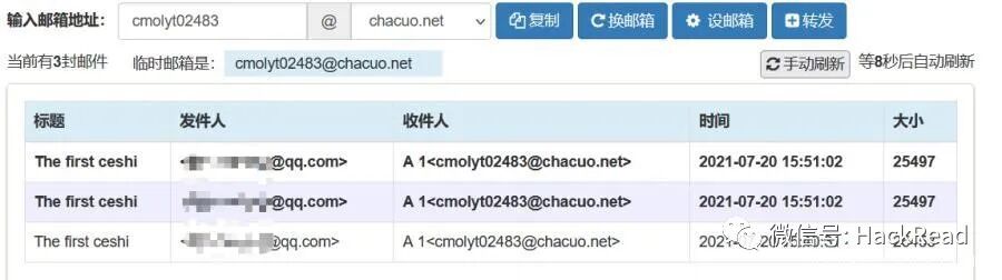 为了方便记录,这里我选择了两个临时邮箱作为演示接收邮箱