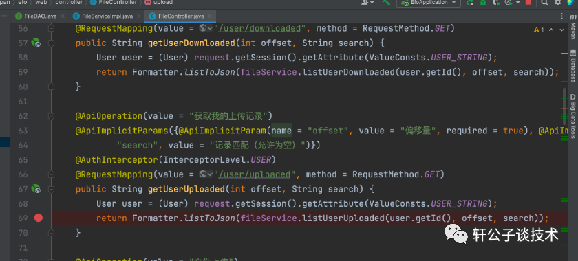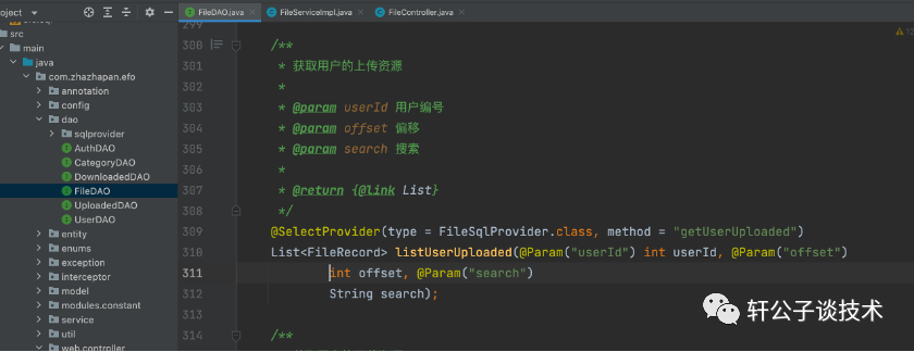 但fileDAO接口只有三个参数,怎么能执行查询语句呢?下面是主要查询代码,算映射FileSqlProvider这个类的getUserUploaded方法