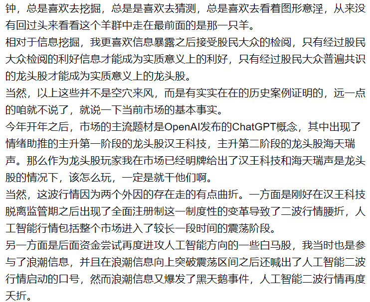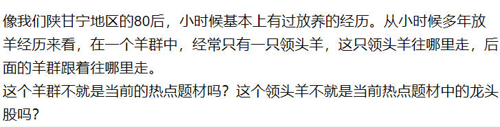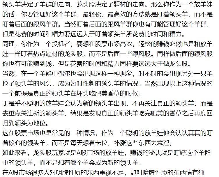 所以,对于龙头股玩家来说,我建议做一个普普通通的放羊娃,不要把大部分时间和精力花费在那只羊有可能成为新的领头羊,而是简单的盯着当前的这只领头羊,并管理好他,一直到新的领头羊出现为止。