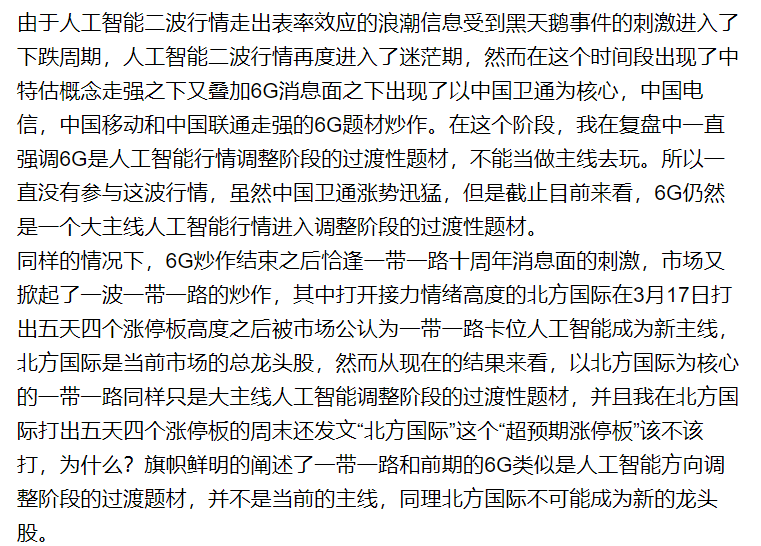 从此来看,人工智能方向不就是整个A股市场上的正统的领头羊嘛!而在人工智能板块进入调整阶段出现的6G和一带一路不就是人工智能这个领头羊埋头吃肥美香草的时候出现的暂时性新的领头羊嘛!那么,你作为一个聪明的放羊娃,你会去选择关注这些暂时性的领头羊嘛?