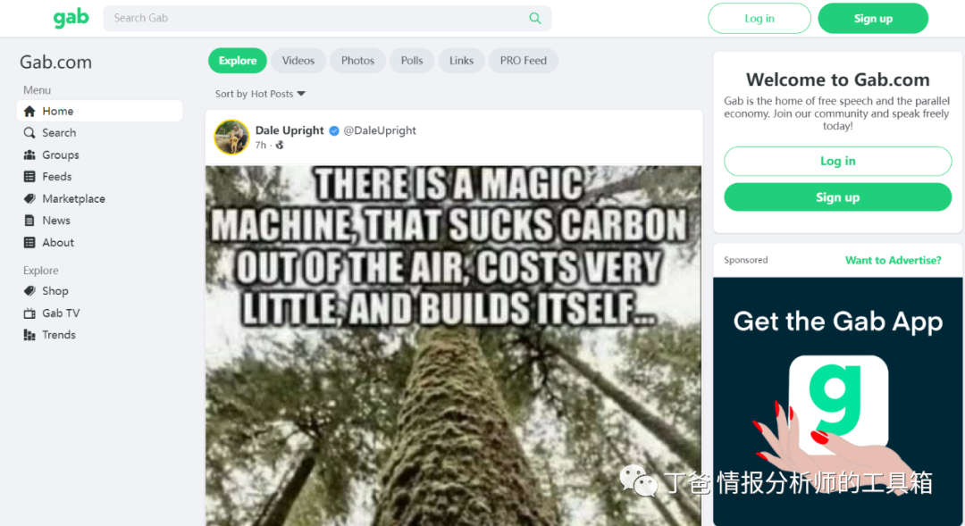 Gab是一个美国的开源社交网络服务平台,支持言论自由和为Twitter的替代品。创始人是安德鲁·托尔巴(兼任CEO)和Ekrem Büyükkaya。它允许用户发表最多300个字符的消息,称为“gabs”。Gab将全世界的保守主义者、古典自由主义者和右翼自由主义者视为目标市场,并将标准右派网站布赖特巴特新闻网和InfoWars视为其主要竞争对手。